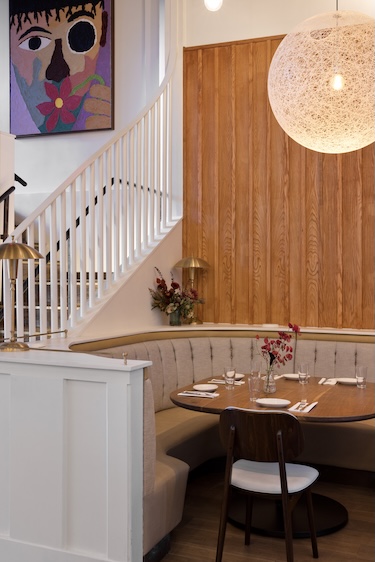 That same playful tone continues in CNC-drilled plywood panels scattered with puzzling, humorous text fabricated by Neva Kocic, who is part of the miniMAX design team and a professor at Parsons School of Design. Custom wood paneling wraps the booth seating, while a sculptural, moon-like light fixture anchors a wrapped dining nook tucked beside the stairs to the mezzanine.