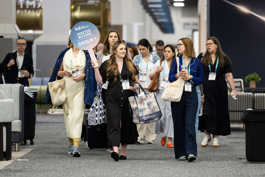 Alice Bailey, Hospitality Design, leads the 2025 Hosted Buyers through the HD Expo + Conference show floor; photo by PWP Studio