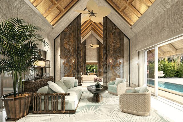 The unique project will reflective the collaborative efforts of international design practice Autoban, Istanbul-based architecture firm Atolye4n, and Tokyo-based Studio Glitt. Inspired by Maldivian culture and environmental preservation efforts, the resort will extensively showcase artisan wood alongside natural, subtle colors that reflect the island’s culture and spirit. The onsite restaurant Saoke will arrive as the first dining concept on the island designed by Japanese architect Noriyoshi Muramatsu, while Vandhoo, Bellinis, and Her Kitchen will round out the culinary options. Cabanas and infinity pods will populate the Mura Bar, which will serve as a bar concept along with the Whiskey Lounge and Wine Cellar.