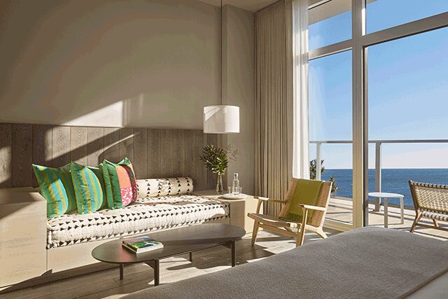 The 54-room boutique hotel is housed across the fourth floor of the Asbury Ocean Club, a forthcoming luxury residence slated to arrive this summer. A vertical plane of glass and natural materials will define the structure, with interiors characterized by levity and openness. Guests are welcome to the fourth floor via a gallery-style reception space. Overlooking the pool deck, the lobby will be anchored by inviting sofas, sunken beds, and floor pillows, while trees and greenery will add a dash of organic charm.