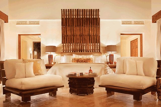 Jeff Jensen, principal designer for New York-based HKS Architects, led the design in collaboration with Frank Butler and Song Chia of Dallas-based firm FAB Studio, landscape architects SWA, and Dallas-based interior design practice Paul Duesing Partners. Featured among the 37 accommodations are 12 beach villas, private one- and two-bedroom suites spanning between 2,000 and 4,000 square feet of indoor-outdoor space. Villas also include private swimming pools and gardens, wraparound decks, outdoor showers, floor-to-ceiling windows, and custom furnishings. Bathrooms are appointed with freestanding soaking tubs and monsoon showers.