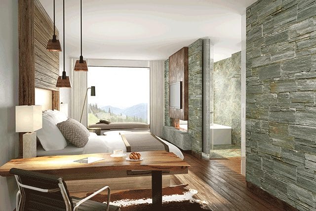 The restoration of the Bürgenstock Hotel reinforces the natural setting with wood and locally sourced stone. All 102 guestrooms and suites will feature brass fireplaces and large windows that frame views of the lake and the Alps. American walnut parquet floors, oak cabinetry and furniture will also be installed, while marble bathrooms will be appointed with walk-in rain showers and double bathtubs. Accommodations will include 82 495-square-foot Deluxe and Executive Lakeview rooms; 20 785-square-foot Bürgenstock Senior suites; 985-square-foot Family suites; the 3,315-square-foot Presidential suite; and top-floor Katara suite, which spans 7,230 square feet and six bedrooms. Amenities will include the Lakeview Bar & Lounge, Spices Kitchen & Terrace, cigar lounge, private 66-seat cinema, wine cellar, and 5,382-square-foot Lakeview Ballroom and Foyer.