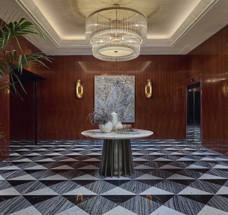 The hotel’s refreshed F&B program introduces Zampo, a new signature Peruvian dining destination, and Silhouette, a reimagined lobby lounge and bar. The material palette layers vein‑cut travertine, textured terrazzo, warm wood tones, and amber‑toned Rojo Alicante marble to create depth and warmth across both spaces.