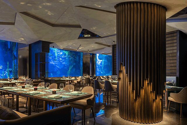 The bar is positioned between the basement of the property and the surface of the water it sits upon. Aquatic-themed artwork punctuates the walls as the rest of the space embarks on an exploration of light and shadow in contrast to the colors of the quarry. Located beneath the tides, Mr. Fisher restaurant is adorned with a ceiling of clandestine crystal details that allow the rock surfaces to shimmer. Two additional F&B options and a cavernous indoor pool are also featured onsite.