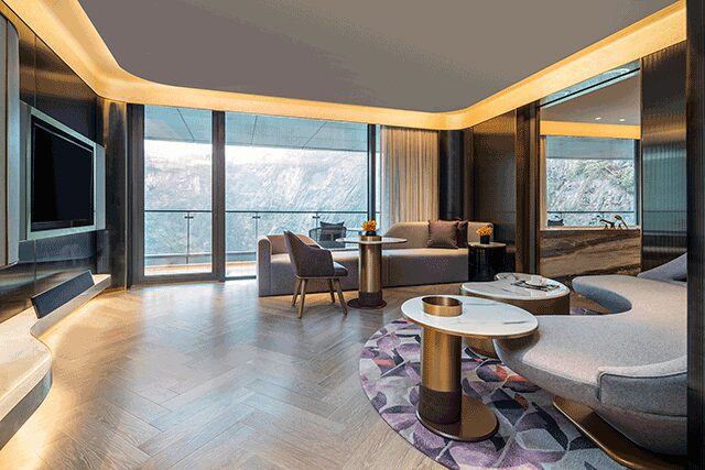The topography of each accommodation varies on each floor, where a different geological theme is expressed. Guestroom designs are accentuated with a palette of red and blue tones influenced by the rock surfaces, while vintage lamps and leather products inject a dash of industrial luxury. Honeymoon suites are housed along the bottom floor, with balconies overlooking the onsite aquarium, while a duplex-style family suite is crafted with interiors reminiscent of a luxury yacht set upon the surface of the water. Designed with James Bond in mind, the presidential suite is also conceived as a clandestine retreat on the cliff’s edge accented with black and gold palette. A large glass curtain wall is featured in the luxe space, framing 270-degrees of natural views.