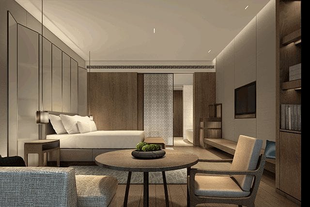 Three onsite F&B options, including a bar and lounge, feature designs from Hong Kong-based designer Andre Fu and AB Concept. The contemporary Cantonese eatery Yun Pavilion has opened alongside the all-day venue Sense, and the Mediterranean concept Aroma. The ground-floor bar Gem and destination bar Mg are also available.