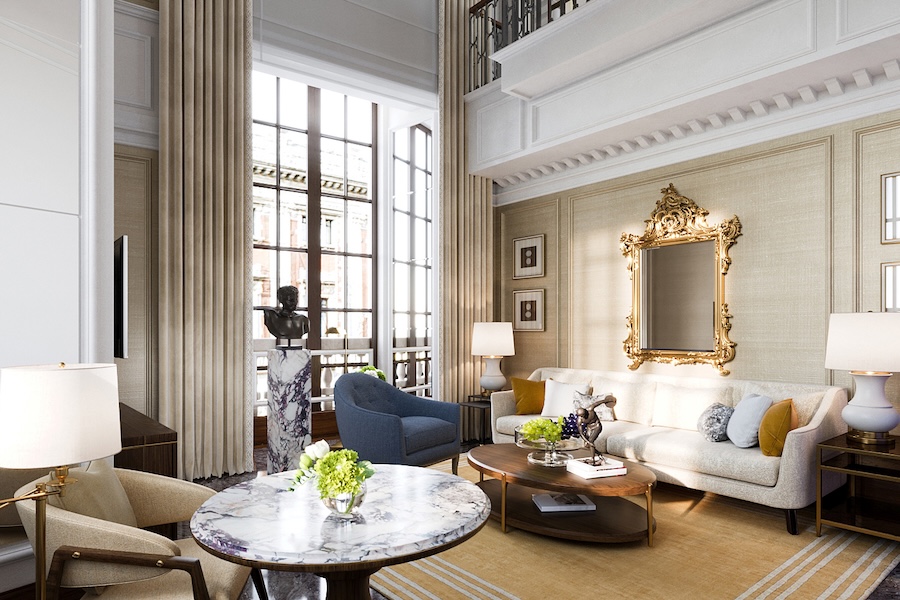Originally built in 1914 by architect Marcello Piacentini, the monumental building served as a financial institution for much of the 20th century. Acquired by Reuben Brothers in 2019, the seven-story, 104,400-square-foot property underwent a meticulous, multi-year restoration. Original marble paneling, frescoes, and carved woodwork were carefully preserved, while new interiors by G.A Group introduce refined, contemporary layers.