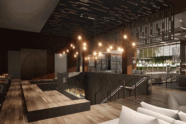 Outfitted with numerous fireplaces, the second floor hosts an indoor-outdoor café and a contemporary fitness space set against the backdrop of Chicago. Fitness areas maintain a visual connection to the onsite terrace, while the property’s restaurant offers both indoor and outdoor dining. The yoga and Pilates studios are crafted with upholstered walls, comfortable benches, and end-grain mesquite floors. The outdoor pooldeck, punctuated with a garden and cenote-like whirlpool, doubles as an ice rink in the winter. A 40-foot-long turf field on the third floor has also been created.