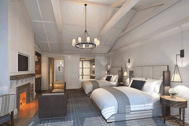 The two Fairway One Cottages will house 1,000-square-foot living rooms, two king bedrooms, two queen bedrooms, and outdoor terraces equipped with a firepit. Each living room will be outfitted with 17-foot-tall ceilings clad with wooden beams, rich wood millwork, and a floor-to-ceiling stacked stone fireplace. Rooms will feature a wet bar, dining area, and oversized furniture, as well as a white architectural palette accented with earth tones. Thirty guestrooms will boast large windows and terraces to ensure a connection with the outdoor setting. A soft, neutral color scheme and classic patterns will evoke elegance across each room.
