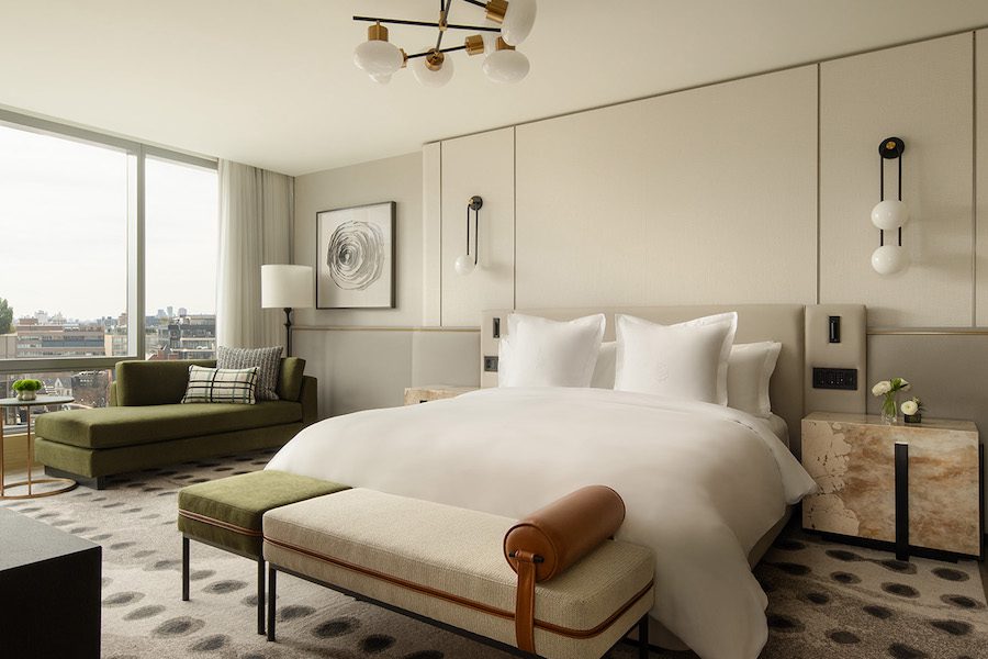 Technological upgrades include a new dimmable, energy-efficient Lutron lighting system, automated drapes, additional power outlets throughout the rooms, and wireless chargers in each nightstand.
