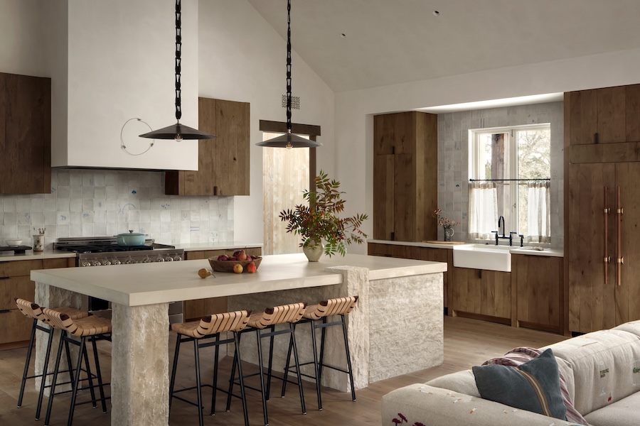 Inside, the architecture subtly echoes traditional German forms through modern silhouettes, paying homage to the area’s cultural roots. Vintage textiles and antique quilts are reimagined as modern art installations, while custom kitchen tiles reflect the region’s native flora and fauna, and local stone creates a dramatic focal point in the kitchen.