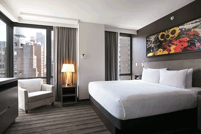Ranging from 270 to 510 square feet, the 150 guestrooms span studio and one-bedroom configurations and boast floor-to-ceiling windows that frame views of the city skyline. Floral artwork inspired by Chelsea’s legacy as the Flower District Rooms complement an understated palette of chocolate soft gray and ivory hues. Outfitted with stainless steel appliances, kitchenettes are installed in 74 suites, while 18 one-bedroom suites feature in-room washer/dryer machines and pull-out sofa beds.