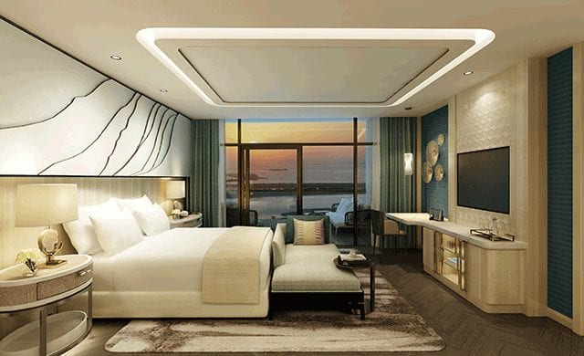 Upon arrival, guests will be greeted by ocean-inspired accents of blue and green, while soft, contemporary furnishings punctuate the lobby. The location informs the aesthetic of the indoor-outdoor all-day dining concept, which will revel in a beachy atmosphere and include a floor pattern reminiscent of ripples in sand. Other public spaces will include a spa, prayer room, meeting spaces, and fitness facility.