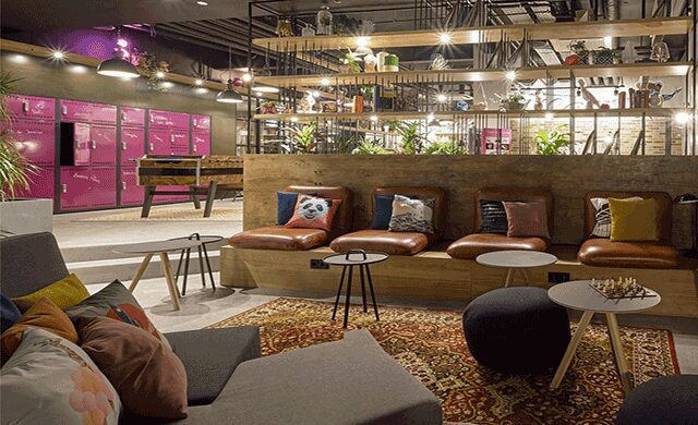 The laidback aesthetic is defined with an open plan and features natural wood, informal seating arrangements, and exposed walls. Beside the entrance, an inviting lounge greets guests, boasting a colorful Persian carpet and a variety of greenery. The living room-style welcome zone, which is outfitted with an open library, also includes poufs, loungers, and beanbag chairs. Light, neutral tones contrast dark ceilings that comprise metal pipes and additional exposed materials. Graffiti adorns concrete surfaces to depict the story of the building. The ground floor also features a coffee shop, buffet, retail, and a bar. Guestrooms are crafted with vibrant tones.