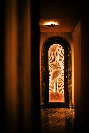 At night, the club takes on a more immersive identity. Crafted as an intimate, high-impact environment, the space features monumental mosaics inspired by mythological figures, heavy velvet curtains that reveal DJs and performers, and a digital scenography designed to evolve throughout the evening. Warm, low lighting creates an intimate, enveloping atmosphere as well.