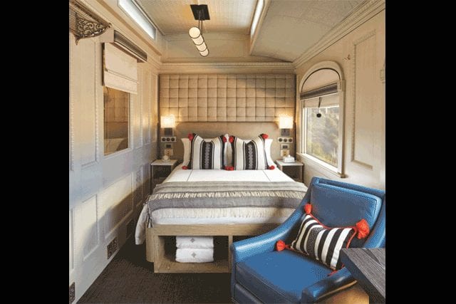 The observation car is equipped with a scrolled outdoor balcony, while interior seating is upholstered in fabrics informed by traditional Peruvian garments with ceramic table lamps in deep teal. Embossed leather chairs with nail heads affixed to chunky timber frames infuse a laidback sensibility into the space. The Piano Bar Car serves as the train’s social hub complete with a glossy black grand piano, gray tweed sofas and lounge chairs, and roman blinds. In addition to two dining cars, the Picaflor Spa car includes three treatment rooms.