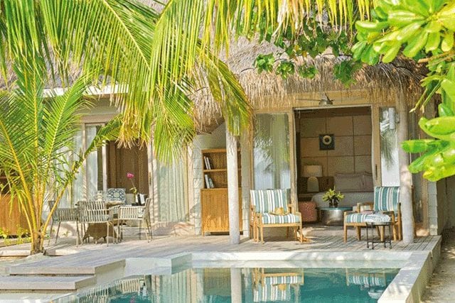 Palm House guestrooms boast undisturbed beach views and a color palette inspired by palm trees. Most of the villas are upgraded with private pools punctuated with sun loungers and outdoor dining areas. Bathrooms feature stone composite bathtubs and outdoor feature showers in the courtyard garden. Stretching out over the Indian Ocean, Shell Houses are designed in a similar fashion to the Palm Houses with larger bedrooms, spacious terraces, and a separate social library area.