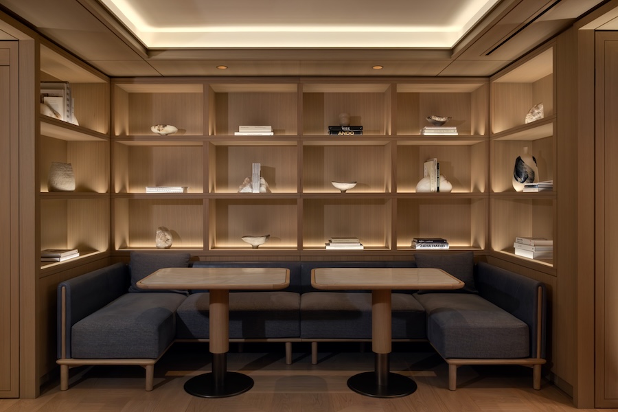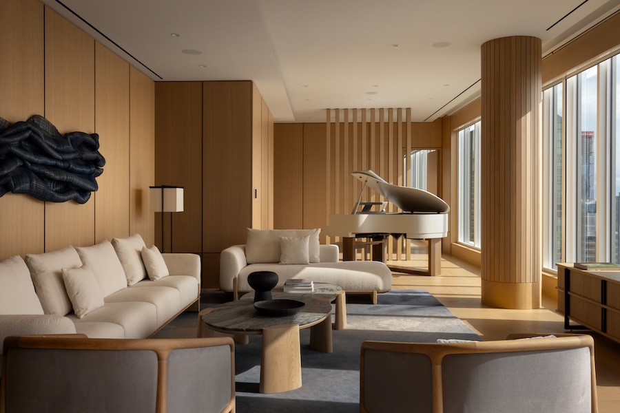 An intentionally restrained material palette creates continuity throughout the public spaces, with weathered Tundra Grey stone from Turkey and rift-cut white oak complemented by carved wood elements and hand-dyed indigo textiles.