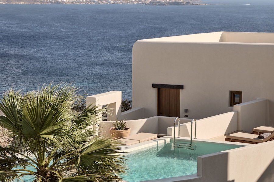 Omeon Mykonos, a five-star, adults-only retreat operated by SWOT, will open later this month on Greece’s Agios Stefanos Bay.
