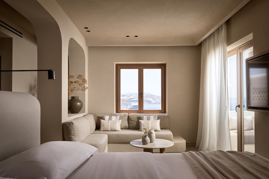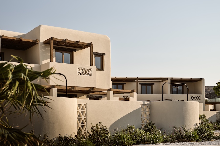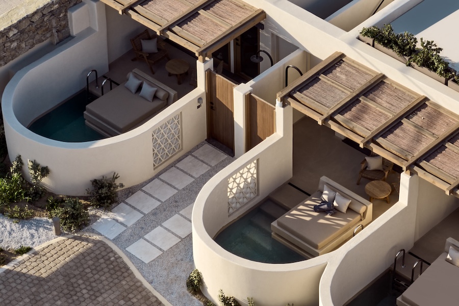The 38-room boutique property, which unfolds across five interwoven buildings, is designed as a sanctuary by Greek architecture firm Urban Soul Project. Its architecture pays homage to Cycladic minimalism, with traditional Myconean forms, delicate claustra, and large windows that play with light and shadow incorporated throughout both communal and private spaces.