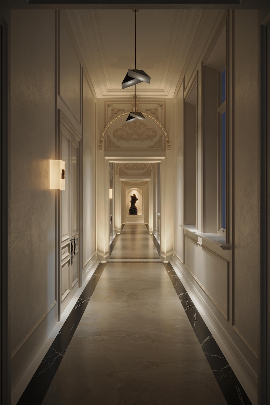 Here, many of the building’s architectural features were preserved, accentuated through soft curves, sculptural silhouettes, and warm classical tones. The design introduces a Paris‑inspired street feel, complete with a traditional French‑style café, layered seating, and kinetic lighting fixtures integrated across the expansive ceiling.