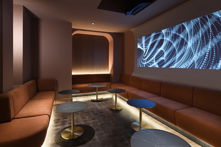 Anchoring the lobby is “the Cosmic Code,” a permanent generative installation created by Behaviour Interactive in collaboration with SonoLux. The immersive digital work responds to music and guest movement in real time, evolving throughout the day as it traces the origins of the universe and the future intersections of technology and humanity.