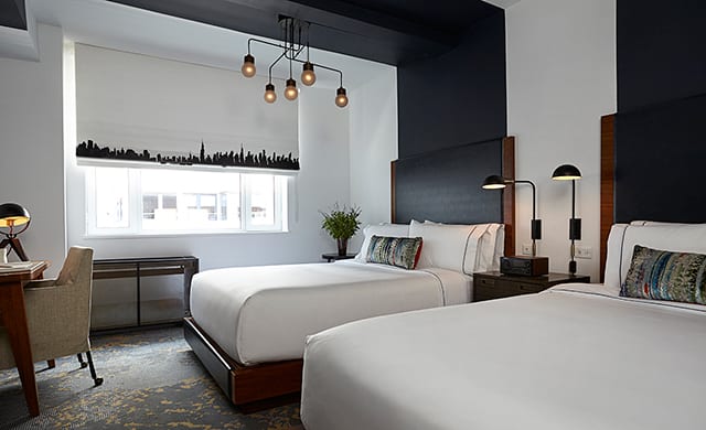 Heading the redesign was New York-based Stonehill & Taylor, who paid homage to the hotel’s 1920s past with references to these iconic individuals and the hotel’s namesake, architect James Renwick, Jr. The loft-style guestrooms and suites include art studio-inspired furnishings and décor, such as easel-like television stands, desks that resemble an artist’s work bench, and carpeting designed to mimic paint-splattered concrete. All suites feature a collection of curated literary works, quotes, and other items reminiscent of the former residents.