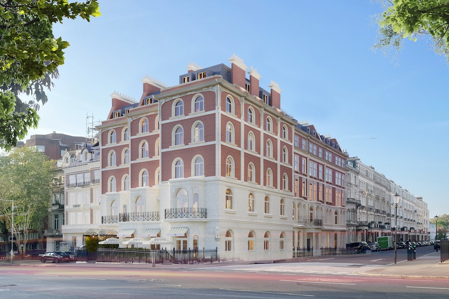 Each of the guestrooms and 14 suites honor the contemporary aesthetic with unique elements like bathrooms enclosed in a translucent glass box and an effortless spatial flow expressed via details like the open and integrated floating closet, desk, and bench. A light palette contrasts colorful accents and textures, from leather headboards to nickel wood finishes. Artisanal metal, decorative shell tabletop finishes, and a marble vanity further convey layers of richness.