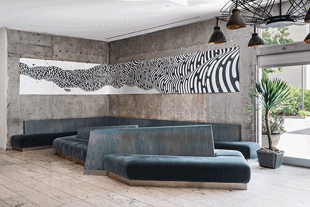 Design elements within the lobby and lobby bar have received updates as well in order to accommodate rotating onsite programming. Persian rugs, communal tables, and even a site-specific installation from designer Henry Taylor adorns the space alongside a Poketo mural from artist Brendan Monroe. The ground floor is also home to a branch of the popular Los Angeles chain Alfred Coffee.
