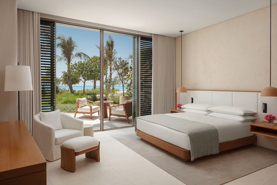 In the guestrooms, coral stone and oak detailing pair with neutral tones and residential-style furnishings to create calming sanctuaries. Select accommodations feature terraces with private plunge pools and direct beach access as well.