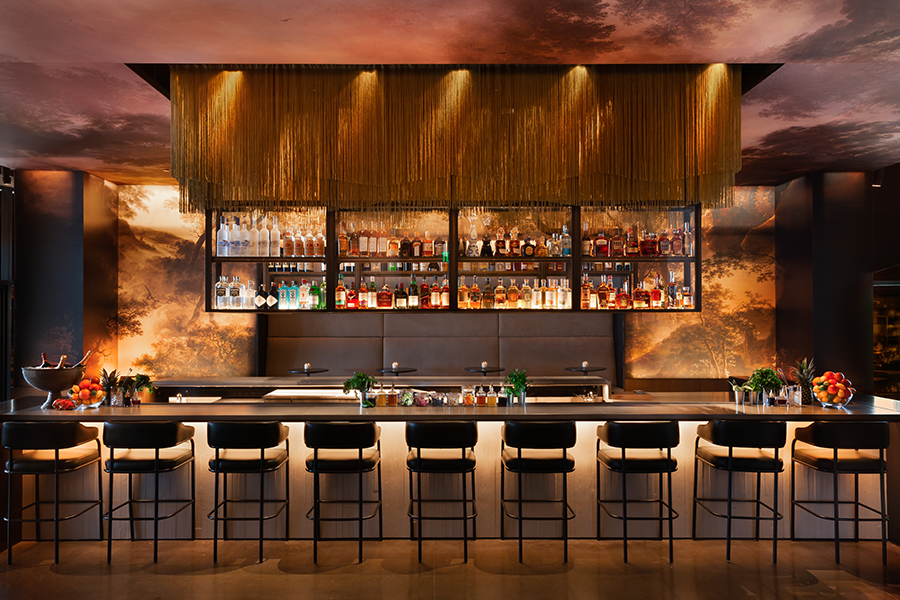The property’s robust onsite F&B lineup includes Carne Mare, both a contemporary and Old World Italian trattoria housed across an open floorplan. Warm walnut millwork and brass accents infuse a moody, rustic quality in tandem with ebony wood floors. Beneath barrel-vaulted ceilings, a show kitchen wrapped in steel and glass functions as the nucleus of the eatery.