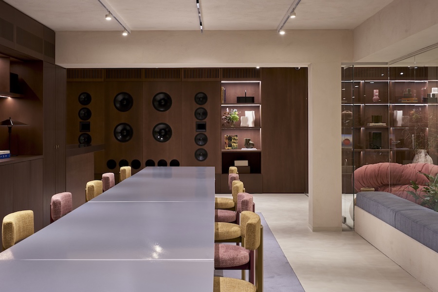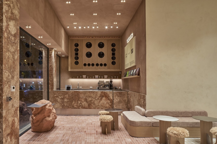 Upon entry, visitors encounter SNEAKS café, a space wrapped in pink olivillo marble and handcrafted clay tiles. This area is designed for flexibility, and can be easily reconfigured to accommodate events or music sessions.