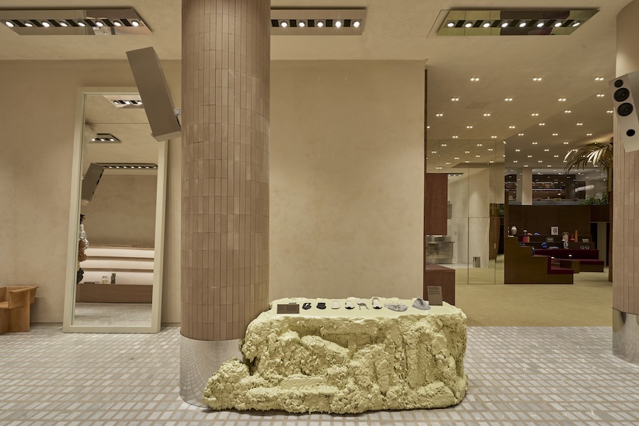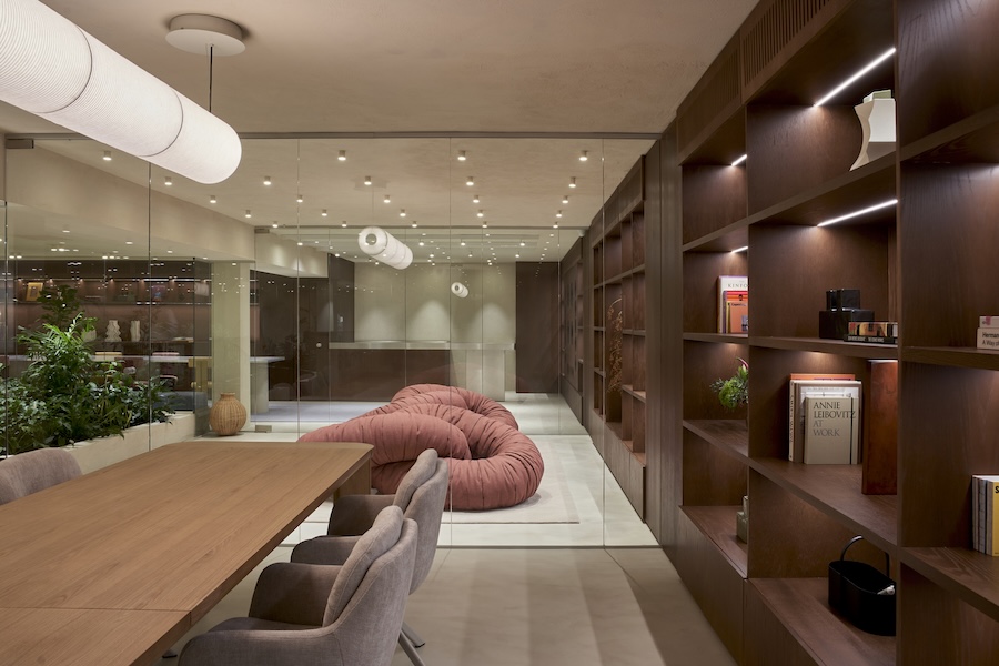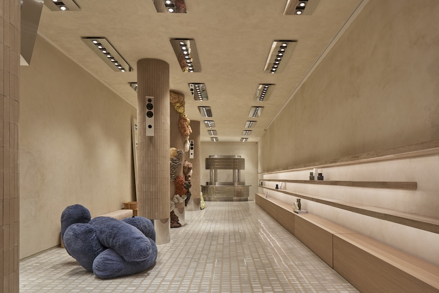 At the core of the store, the Stage presents HOFF’s collections on three elongated travertine shelves. A bespoke terrazzo flooring—developed exclusively for the brand—unifies the space and establishes HOFF’s chromatic identity. Custom lighting responds to natural light and programmatic shifts throughout the day, while sculptural pieces by Sara Regal, Casa Antillón, and Elisabeth Blumen punctuate the area.