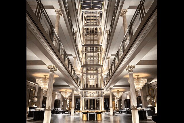 Totaling 90,000 square feet, the modern building comprises steel and glass as well as the preserved historic brick façade. Cast iron I-beams evoke the heritage of the neighborhood, while a skylit, six-story atrium welcomes visitors and a transparent lift provides transport to the glass-encased Rooftop Restaurant and Outdoor Park. Open throughout the year, the Rooftop Restaurant is appointed with crystal chandeliers, Asiatic jasmine plants, Japanese boxwood hedging, and numerous pleached London plane trees. The space organically connects to the Park & Wine Terrace, which features a series of intimate garden rooms outfitted with overhead canopies, sculptural evergreens, and fountains. The Barista Bar on the third floor rounds out F&B options onsite, complete with an adjacent outdoor terrace.