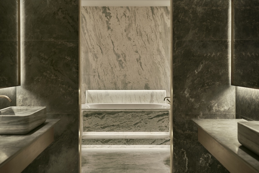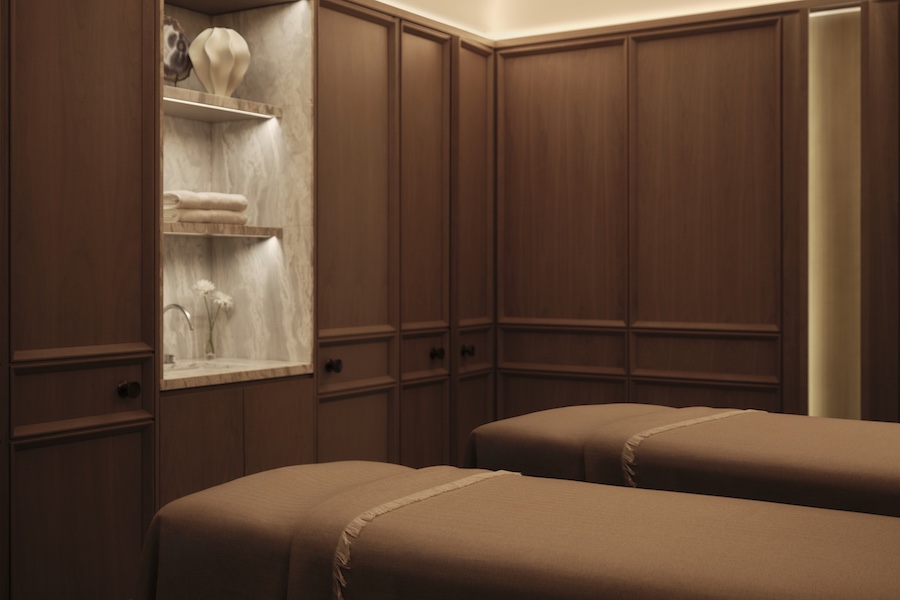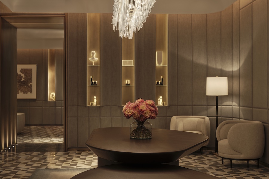 “We broke from the typical spa vernacular to establish a language rooted in permanence and place,” says George Yabu, cofounder of Yabu Pushelberg. “Paneled walls, intricately patterned stone floors, and carefully scaled rooms were conceived as you would find in a residence. Every element, from the proportion of spaces to the materiality, was designed to feel enduring and aligned with the Rosewood brand.”