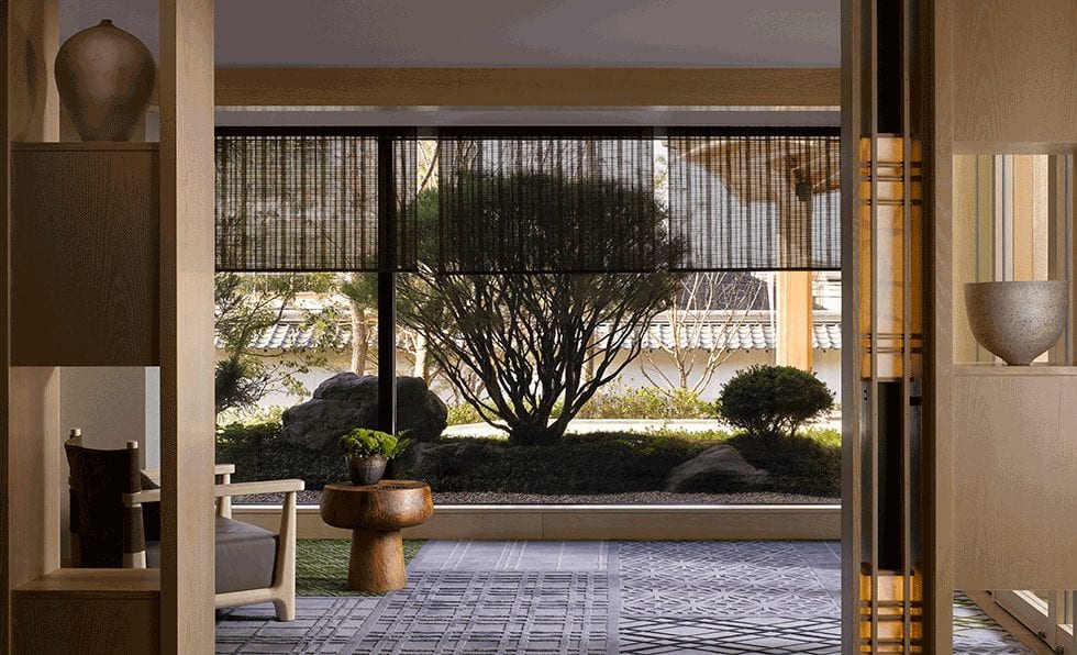 Expansive glass windows in the Four Seasons Hotel Kyoto lobby connect the interiors to the outside.