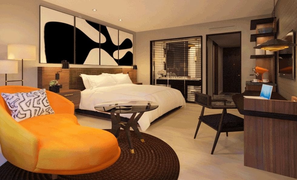 A rendering of a Joseph Dirand-designed guestroom at the upcoming Surf Club in Miami, which will feature a tropical bench that adds a pop of color to the serene setting.