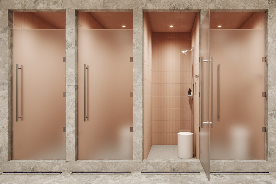 Meanwhile, fitness spaces lean into a more futuristic expression. In the spin studio, dynamic linear lighting traces the contours of the room, while deep hues and curved ceiling and wall details create a cinematic atmosphere.
