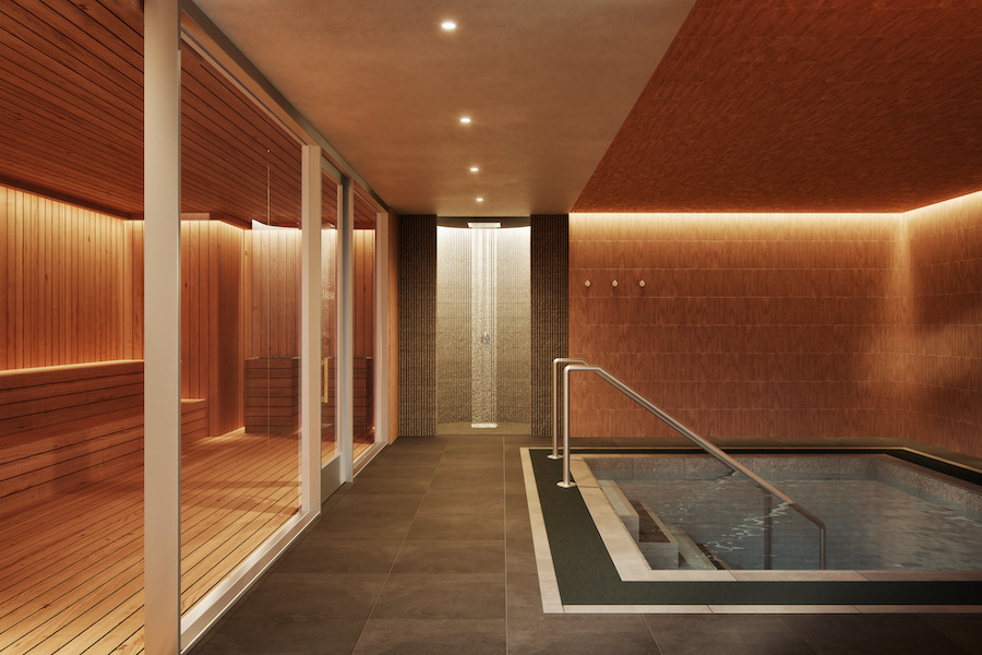 A discreet contrast therapy suite, designed as a hidden sanctuary, combines warm cedar, natural stone, and ambient lighting. A deep-heat sauna and temperature-regulated cold plunge create a restorative counterpoint to the surrounding open-concept interiors, with heated non-slip flooring and hydration stations.