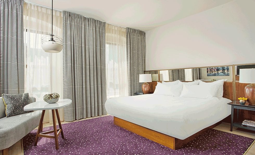 A model guestroom at the upcoming 21c Nashville, where bright colors and patterns juxtapose wood and metal.