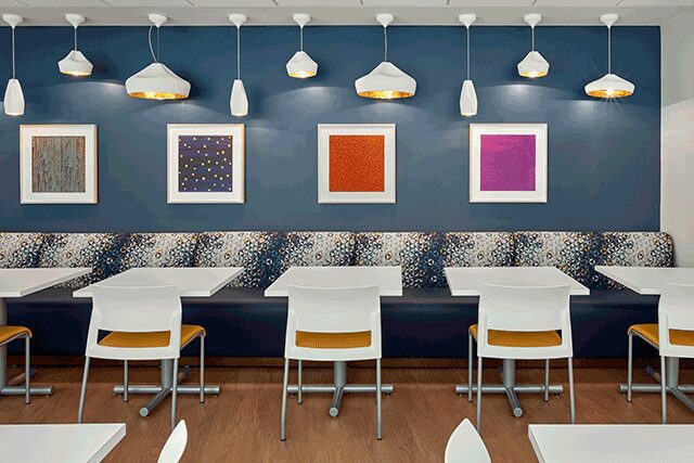 One that we found particularly interesting was the airline industry. People don’t want to miss their fight, so they stay near the gate. The same thing happens with patients; they don’t want to miss their appointments. They want to sit near the desk, so they’re not forgotten. The airline industry reinvented the gate area by integrating foodservices, retail, and iPads, which allow people to do what they need to do but do it close to the gate. We took those ideas and we applied them to our waiting areas. We’ve created different seating types and areas that provide options for patients. If I want to bring my laptop and plug in and sit somewhere, I have the ability to do that. If I don’t feel like being social, I can find a seating area that’s secluded and private. Conversely, if I’m with a large family and there’s a group of us, we’ve created what we call camp sites, which allow families to cluster together and feel like they have a private space. All the while, there is visualization by our staff, so they can see everybody.