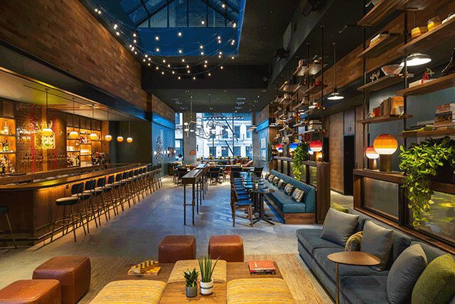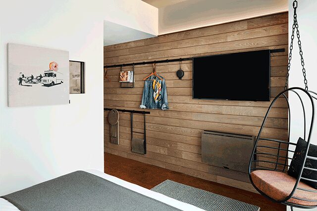 We decided to give the customer exactly what we thought they wanted: great bathrooms with oversized showers, luxury fixtures, and custom robes. Guestrooms also feature floor-to-ceiling windows with spectacular views, sophisticated lighting, shades and temperature controls, and a hanging swing chair. In addition, we wanted to create an authentic lounge experience, which is how we conceptualized Recreation. The result is a 5,000-square-foot space that serves as communal coworking by day and a lounge at night serving specialty cocktails and great food with lots of fun games and it’s New York’s only hotel with a basketball court.