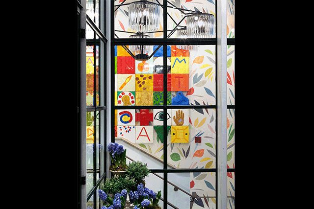 A colorful piece by Pop artist Joe Tilson selected by Cristea adorns a stairwell at the Whitby Hotel