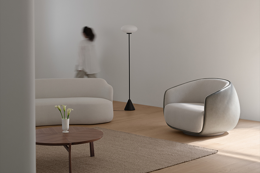 Pesca, a swiveling one-seater sofa, showcases a cocooning profile that references the peaches he relished on family visits to the homeland. The shape of the fruit and the way it is naturally held “became a practical starting point for thinking about comfort and proportion,” says the founder and principal of Toronto- and Miami-based Studio Munge. “I imagined taking a peach and carving out a portion of it to create a cradle that would become the seat. The plush upholstery and rounded contours make the pieces feel like you are being gently held.”