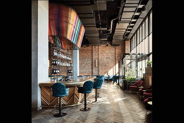 An installation made from colorful threads hangs above the bar at the Williamsburg Hotel in Brooklyn.