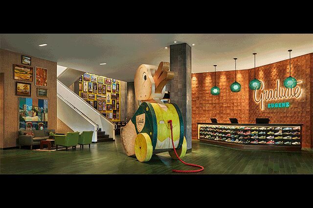 An oversized duck toy in the Graduate Eugene’s lobby playfully references the University of Oregon’s mascot