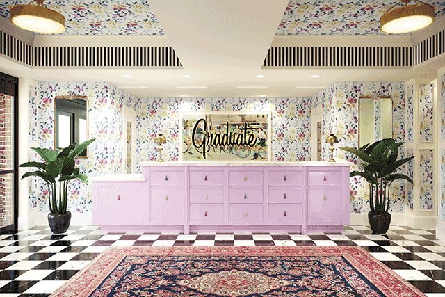 Alford joined AJ Capital Partners in 2013, where owner and founder Ben Weprin pitched him the idea of Graduate as a new type of hotel that celebrated college towns, which often lacked vibrant lifestyle properties. It was a perfect fit for Alford, who took what he learned from his time working at Universal Studios and Kimpton Hotels and merged those lessons into a concept that is at once nostalgic and eclectic. The brand, he says, “rekindles those feelings of camaraderie, of new experiences and ideas” that comes with the wide-eyed excitement of being an undergrad. He calls the design strategy a “greatest hits radio station,” using the local history of small college markets to create playful, colorful guest experiences. “We’re writing a love letter to each one of these communities,” Alford says, “and you can’t plagiarize a love letter.”