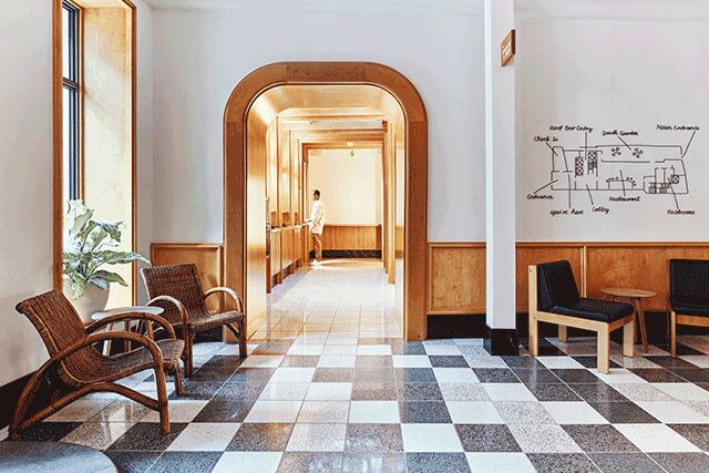 Modernism without minimalism is the ethos of Sister City, keeping the aesthetic “organic, warm, and human,” Wilson says. In the all-day, onsite restaurant Floret, for instance, a marble bar that mimics the casualness of an Italian espresso café is paired with vintage seating reminiscent of Finnish architect and designer Alvar Aalto’s work.