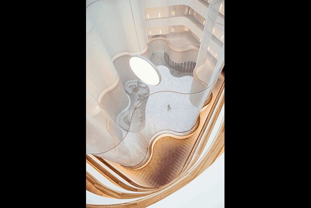 An undulating light fixture hangs in the lobby atrium at the Conrad Washington, DC, designed by Herzog & de Meuron, HKS, and Rottet Studio