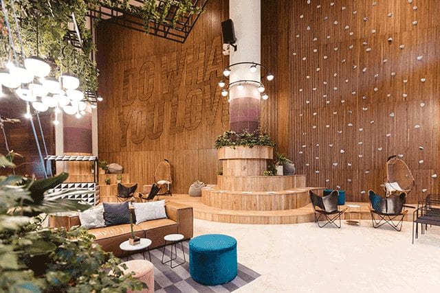 This year alone, WeWork has expanded to Detroit, Beijing, and more recently Buenos Aires, Sao Paulo, and Paris. WeWork Torre Bellini in Buenos Aires has a really impressive voluminous lobby space. There is custom millwork throughout the lobby, native Brazilian plants hanging above to bring the outside in, and a fully functional rock-climbing wall. Our members in WeWork La Fayette enjoy a beautiful 22-foot atrium for workspace where the ceilings are made of its original glass blocks. It has amazing natural light and a great Art Deco vibe that I just love.